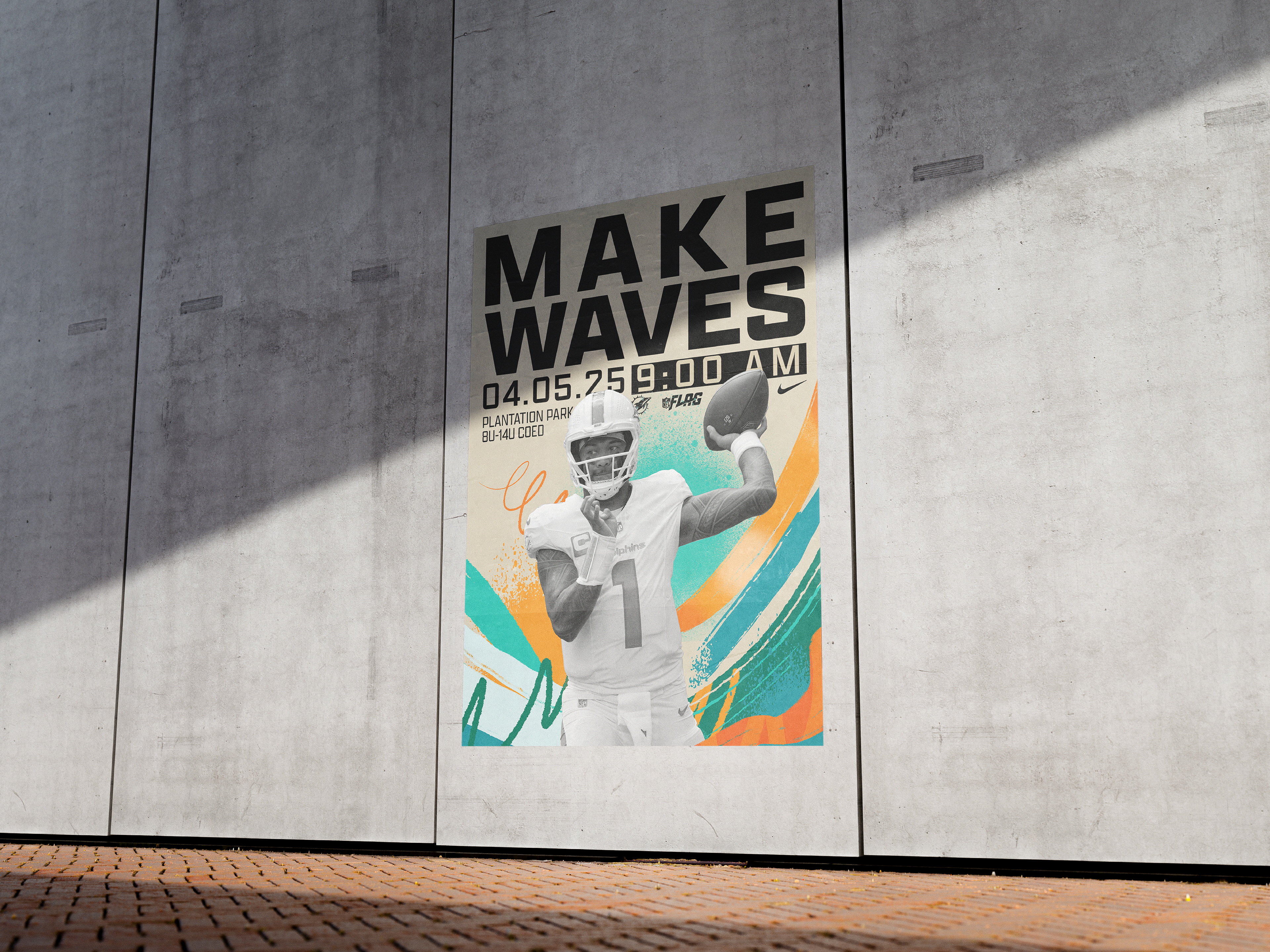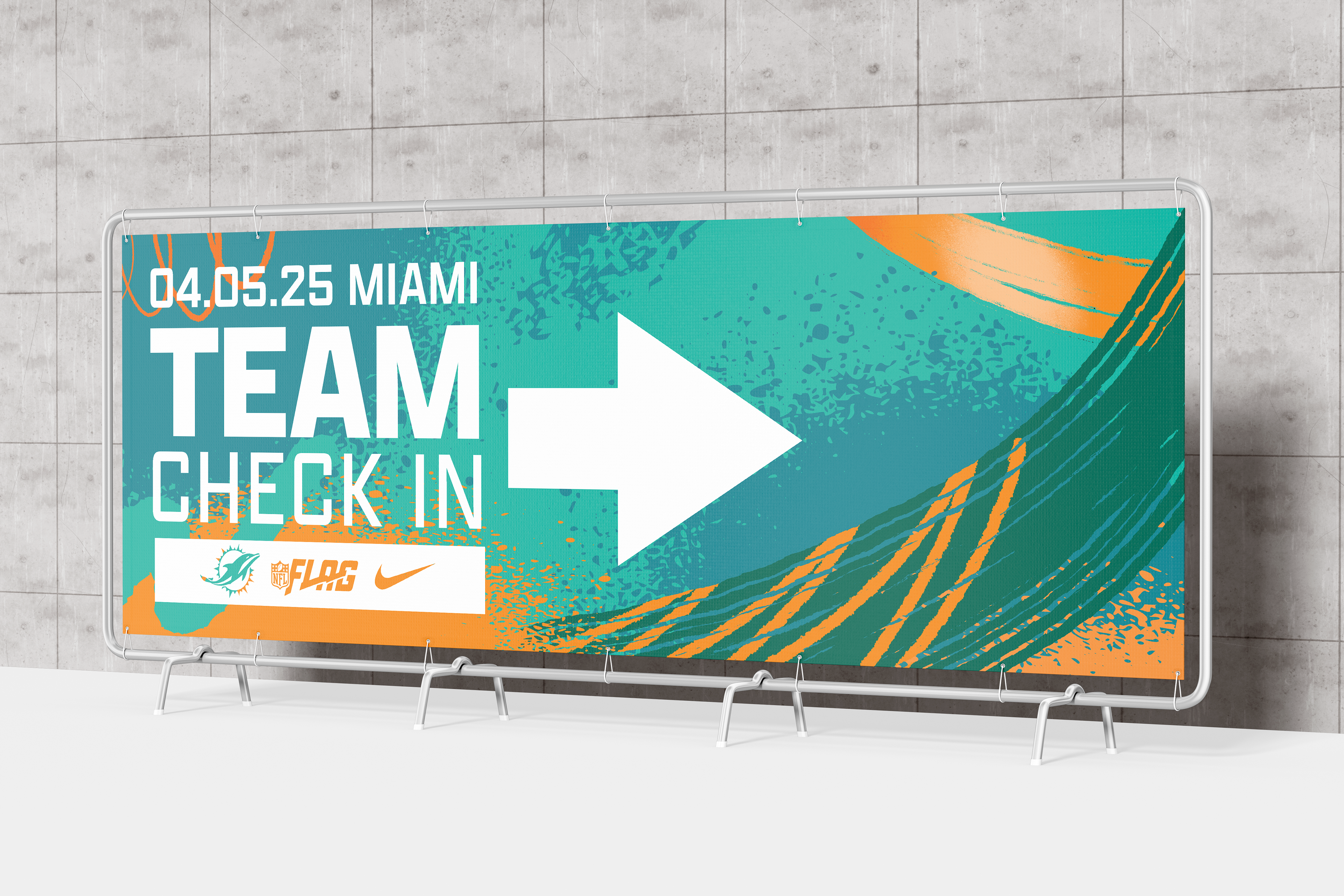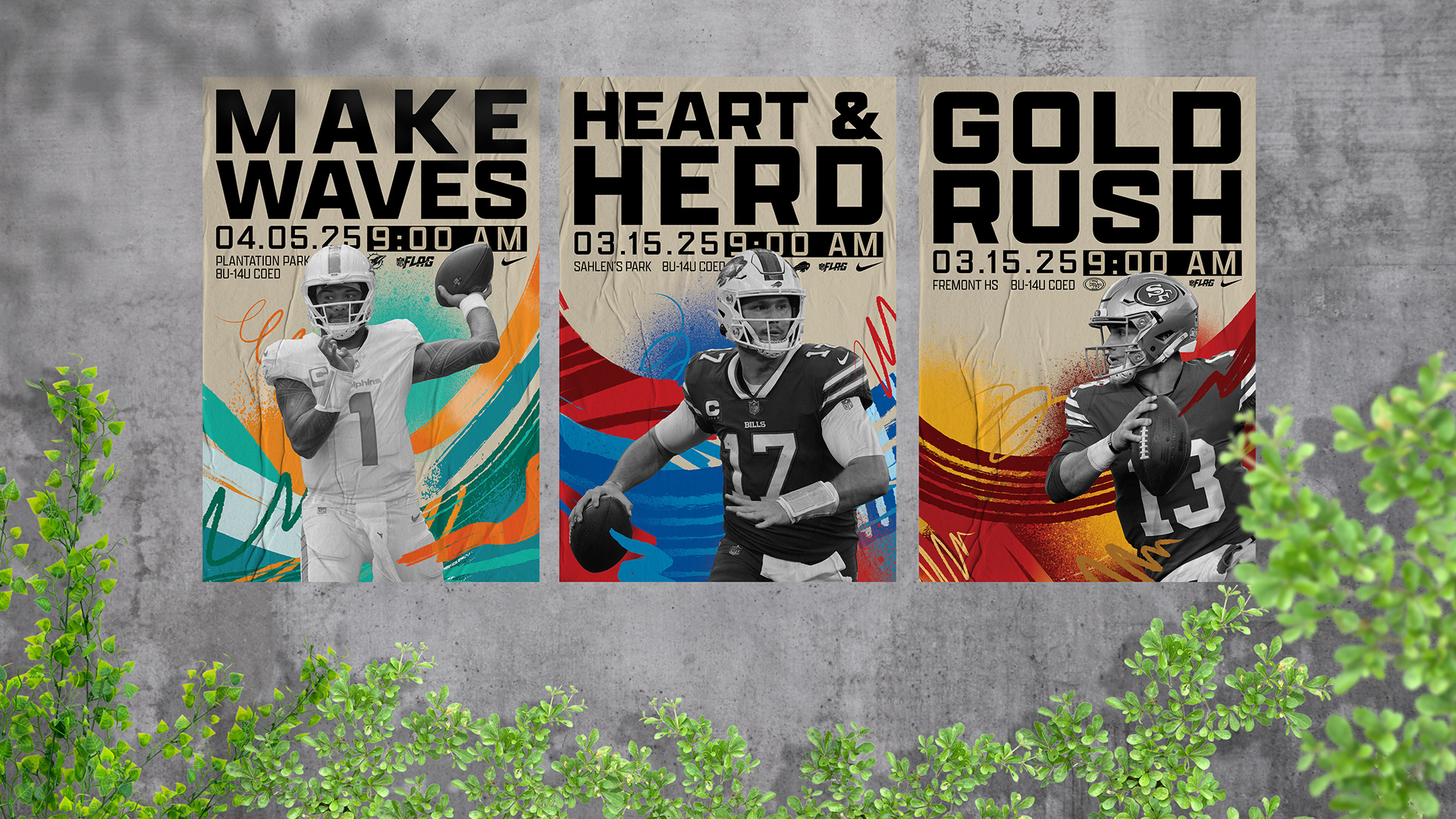 For this class branding project, I created posters and event signage for the NFL Flag Football program. The objective was to combine teams' branding, elite high-level athletic design, and be playful enough for kids.